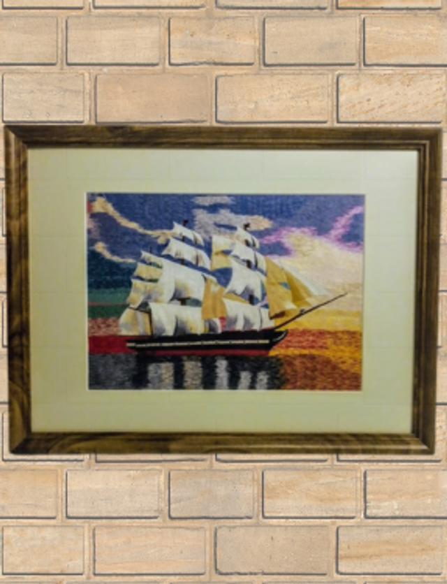 Cette œuvre unique n'est pas une simple broderie, mais une véritable peinture à l'aiguille, où le fil remplace le pinceau pour immortaliser la majesté des vieux gréements.