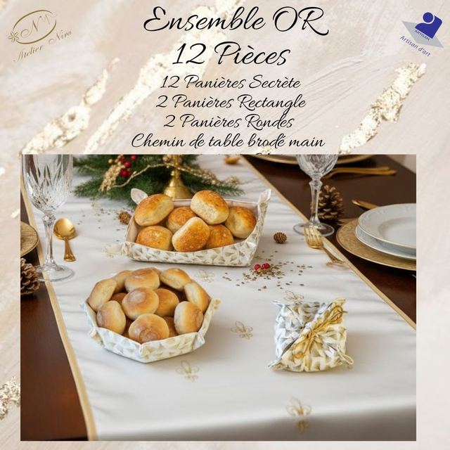 Chaque élément de cet ensemble a "service or" été pensé et brodé à la main pour faire de vos repas de fête un moment inoubliable. L'éclat de l'or sur un fond blanc immaculé offre une décoration festive et raffinée, traditionnels. en coton satiné.