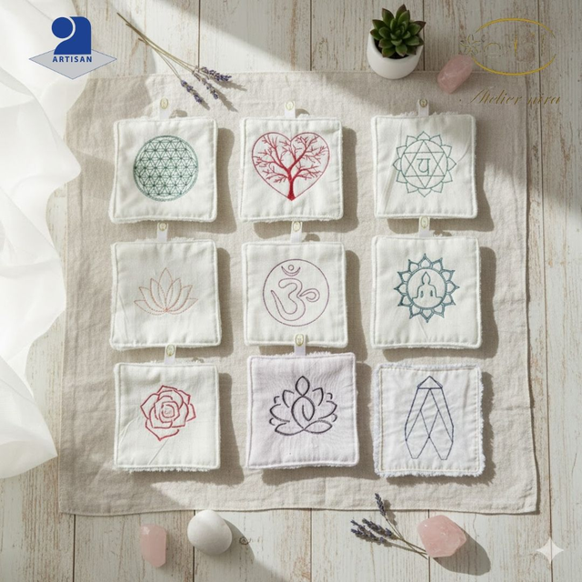 Les lingettes sont ornés de broderies originales créées par l'Atelier nira, transformant une lingette quotidienne en un petit objet d'art.
