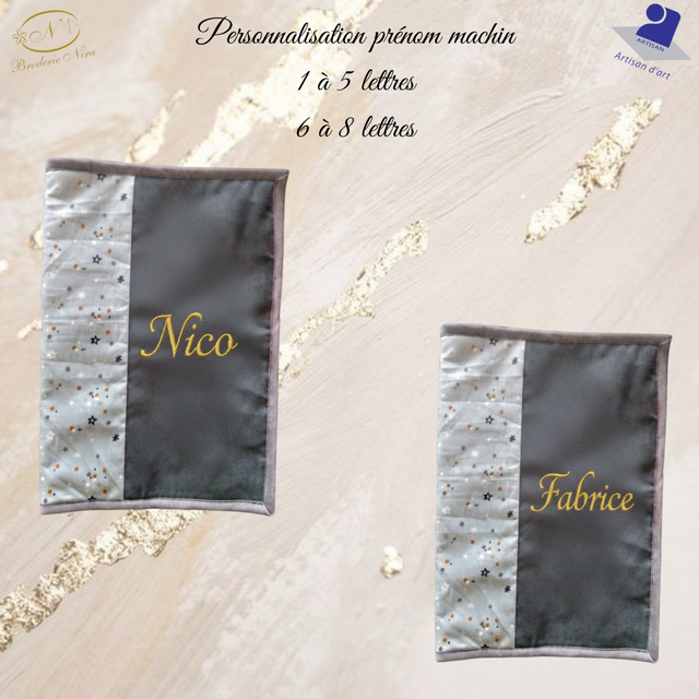 Lors de la validation, envoyez-nous un message à "l’intention du commerçant" mettre le Prénom ou les Initiale et la couleur du fil de broderie. Convenir tu choix du tissu en mp.